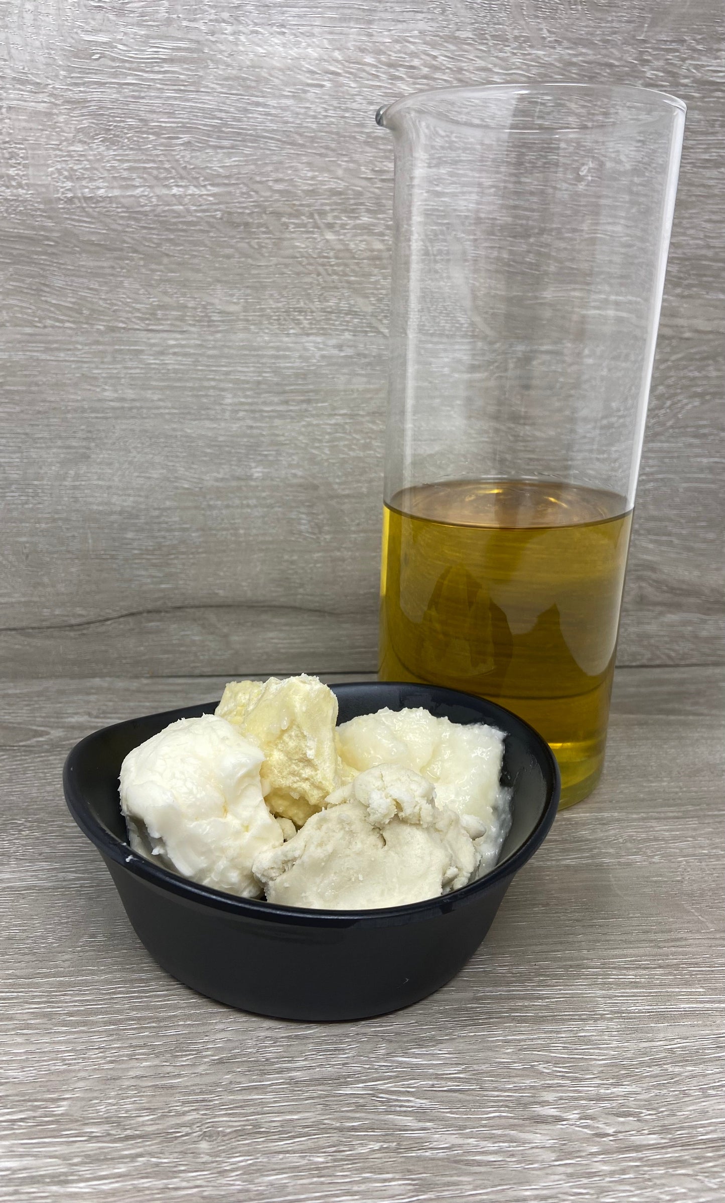La mezcla de aceites contiene: aceite de oliva, aceite de coco, aceite de ricino, manteca vegetal, manteca de cacao, manteca de karité y manteca de mango.